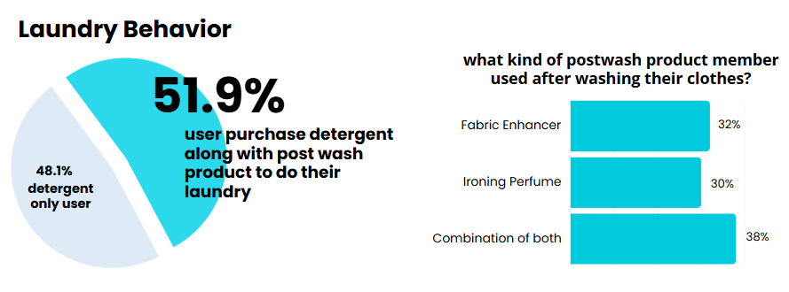 To summarize, the increase in sales of laundry products is driven by a growing number of consumers making purchases. This growth is primarily due to the rising demand for both post-wash and main-wash products. On average, consumers do laundry 2–3 times a week using a washing machine. They tend to have specific preferences when it comes to add-on products such as fabric enhancers. Some consumers feel that fabric enhancers are unnecessary, as the fragrance tends to fade after air-drying. Others, however, believe that using fabric enhancers helps maintain a pleasant scent on clothes—especially when drying laundry during the rainy season.