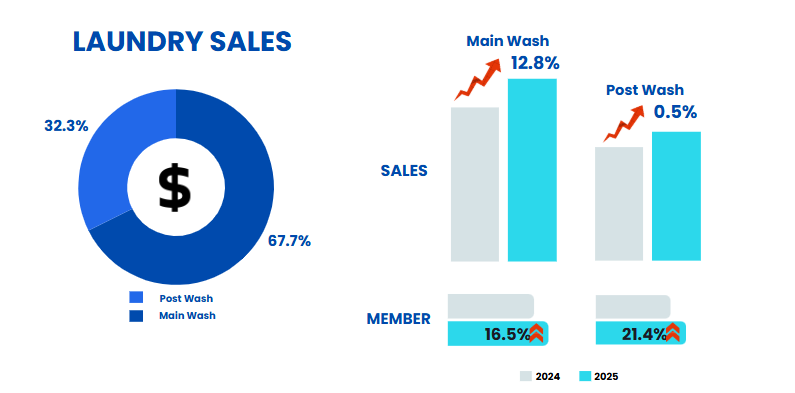 Main Wash showed very solid performance, contributing nearly 70% to total sales. This growth (12.8%) is in line with the significant increase in the number of members (16.5%). On the other hand, Post Wash sales growth has remained stagnant at 0.5%, but it shows a very positive performance in terms of member growth with 21.4%.
