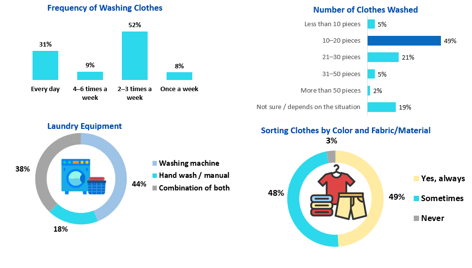 Most consumers wash 2–3 times a week using a washing machine, typically washing 10–20 items per load, and they usually sort the clothes first.