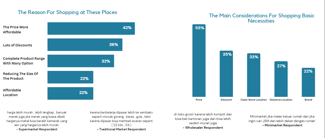 The price is often the most important factor to consider when buying essential needs, as consumers tend to look for cheaper places with many discounts to help reduce their expenses. However, the completeness of products is also an important consideration, as consumers may prefer to shop at stores that offer a wide variety of items to choose from.
