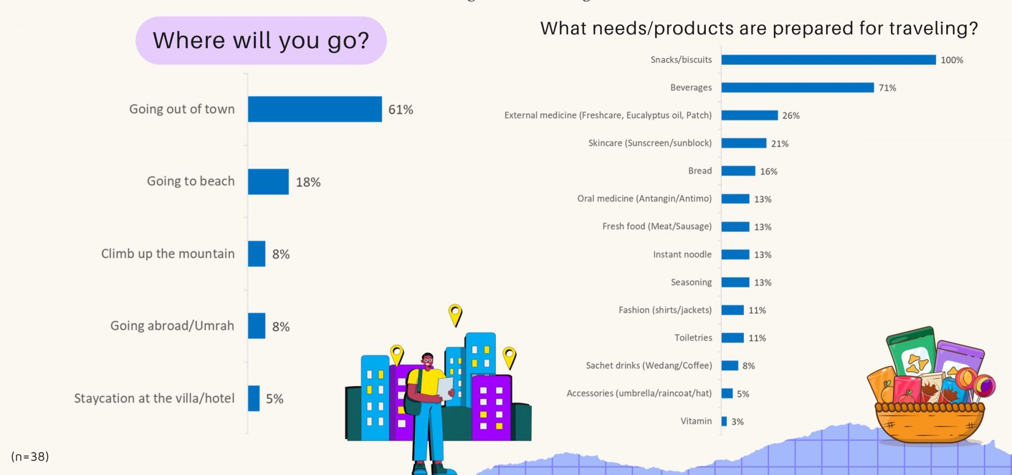 The majority of consumers prefer to going out of town in the end of year, and almost of them will prapare snack/biscuits and beverages for traveling.