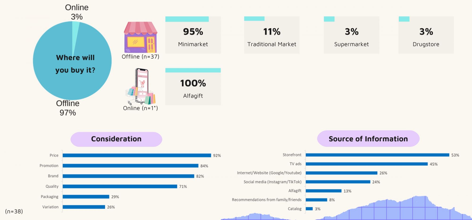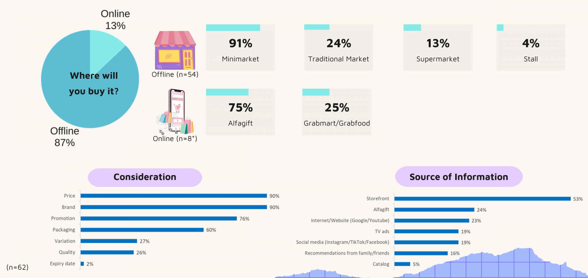 The majority of consumers prefer offline channels, especially in minimarkets, to purchase necessities/products for traveling. The primary consideration is price, and most of them become aware of the product through storefronts.