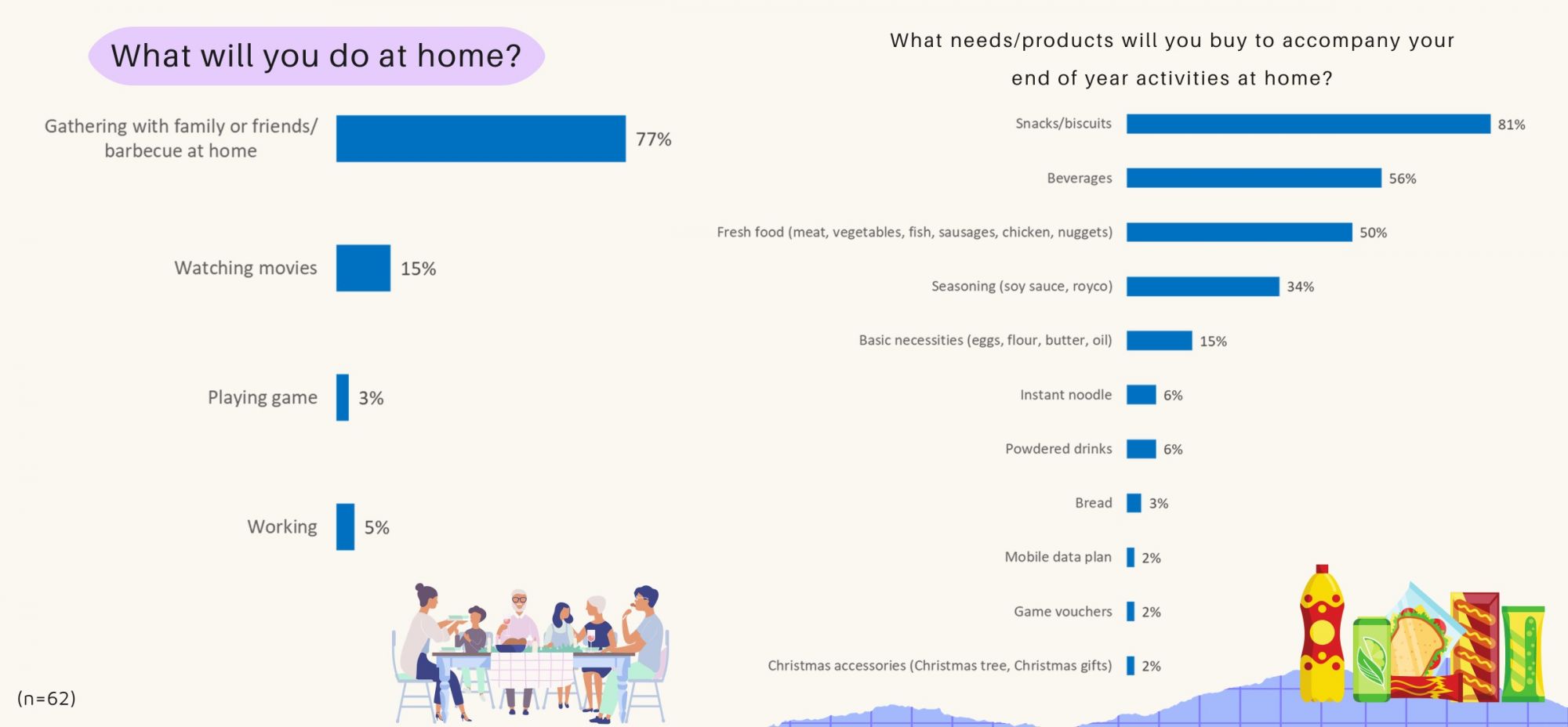 The majority of consumers prefer gathering with family or friends/barbecuing at home to celebrate Christmas/New Year, and most consumers will prepare snacks/biscuits and beverages to accompany their activities at home