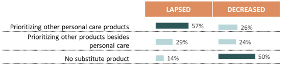 Those who have stopped purchasing (lapsed) or reduced their spending on personal care products tend to switch to natural alternatives, such as natural deodorants, as a more affordable yet effective way to stay fresh and maintain healthy skin. they also prioritize on other category such as Ciggarete after discontinued purchase personal care.