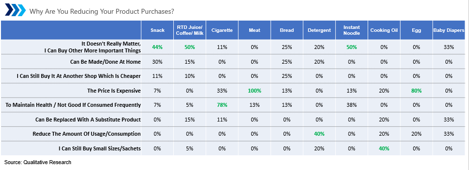 Consumers tend to reduce their purchases of snacks, RTD juice/coffee/milk, and instant noodles because they are not important, and they can buy other more important things. Consumers tend to reduce the purchase of cigarettes because to maintain their health or not good if consumed frequently. Consumers tend to reduce spending on meat and eggs because they are expensive. Consumers tend to reduce their purchases of detergent and cooking oil because they can reduce the amount of usage/consumption, or buy smaller ones/sachets.