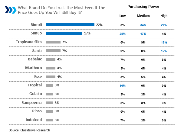 The most trusted brand is Bimoli, followed by SunCo. This shows that the cooking oil brand is the brand most trusted by consumers, even though the price goes up, they will still buy it.
