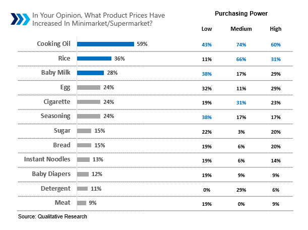 Majority of consumers feel that the prices of products in minimarkets/supermarkets have increased, especially the prices of cooking oil, rice, and milk. For consumers with low purchasing power, they feel that seasoning (chili, onions, condiments) has increased. Meanwhile, consumers with medium purchasing Power feel that the price of cigarettes has increased.