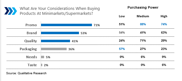 The main considerations of consumers in shopping are promos, brands, and quality. The interesting thing is that consumers with low purchasing power are more concerned about packaging.