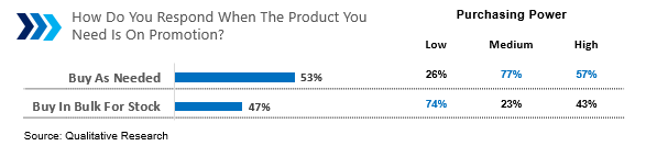 When there is a promo, consumers with medium-high purchasing power tend to shop according to their needs. Meanwhile, consumers with low purchasing power tend to shop in large quantities for stock.