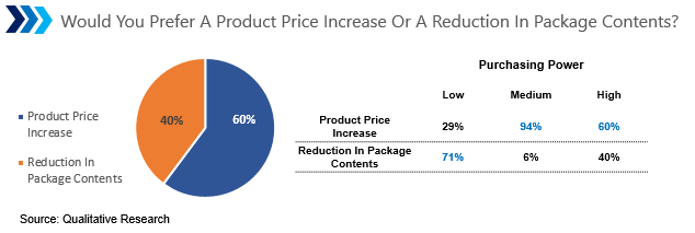 Interestingly, consumers with low purchasing power prefer reduced package content to product price increases. Meanwhile, consumers with middle to high purchasing power prefer a product price increase rather than a reduction in package contents.