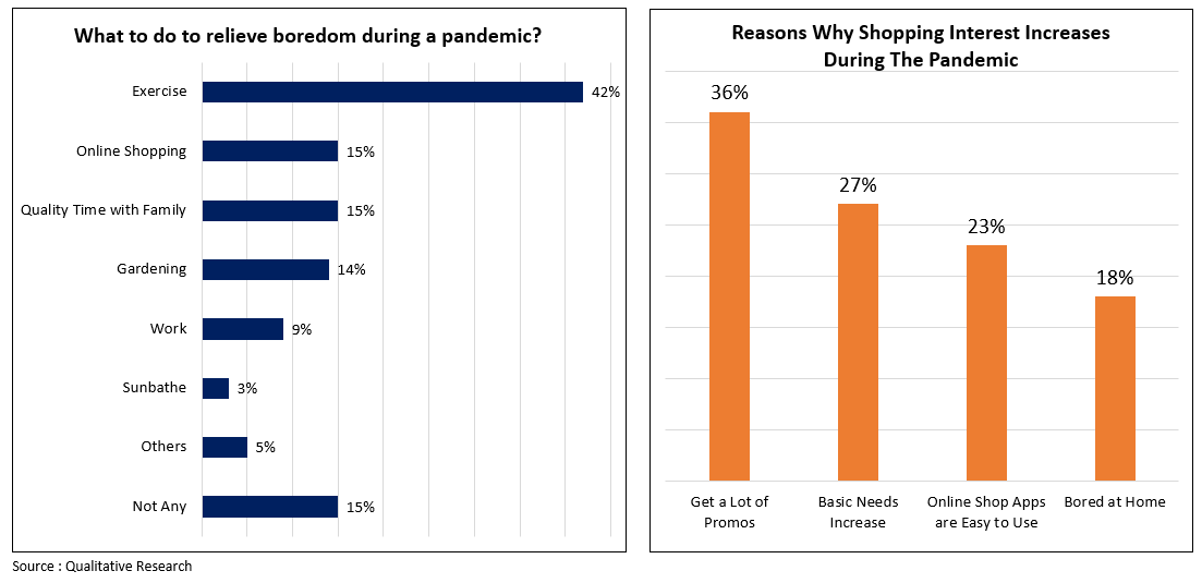Furthermore, to relieve boredom during the pandemic, one of the top 3 activities that people do is online shopping. Because of its convenience, many discounts, and many other benefits from online shopping, this makes people's excited and increases their shopping interest.