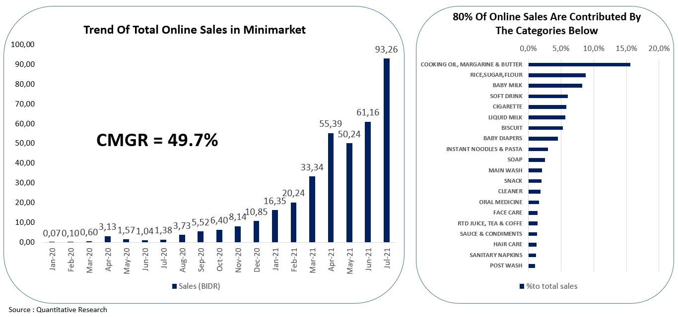 Online sales at minimarkets grew very rapidly from the beginning of the pandemic until now. The product categories that are purchased the most at minimarkets via online are basic needs such as cooking oil, rice, and sugar.
