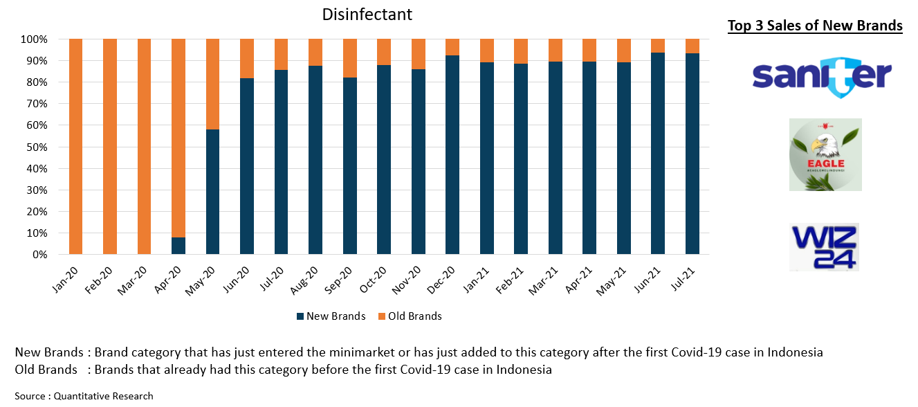 Furthermore, about external protection against the virus, disinfectant products are also one of the solutions. However, before the pandemic, there were very few disinfectant brands available in minimarkets. This surely became an opportunity for several brands to diversify their products category. And as seen from the data above, currently 90% of disinfectant sales in minimarkets are dominated by new brands.