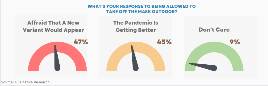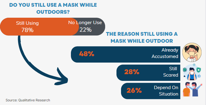 Based on a PT Global Loyalty Indonesia survey, 87% of people know that the government allows masks outdoors. However, there are two different views, 47% of people fear that other virus variants will appear on June 6, 2022, [2] has entered and confirmed positive for New Variant Omicron BA.4 and BA.5 in Indonesia. Meanwhile, 45% of people feel happy because when the government allows them to take off their masks outdoors, it means the pandemic is improving or more controlled.