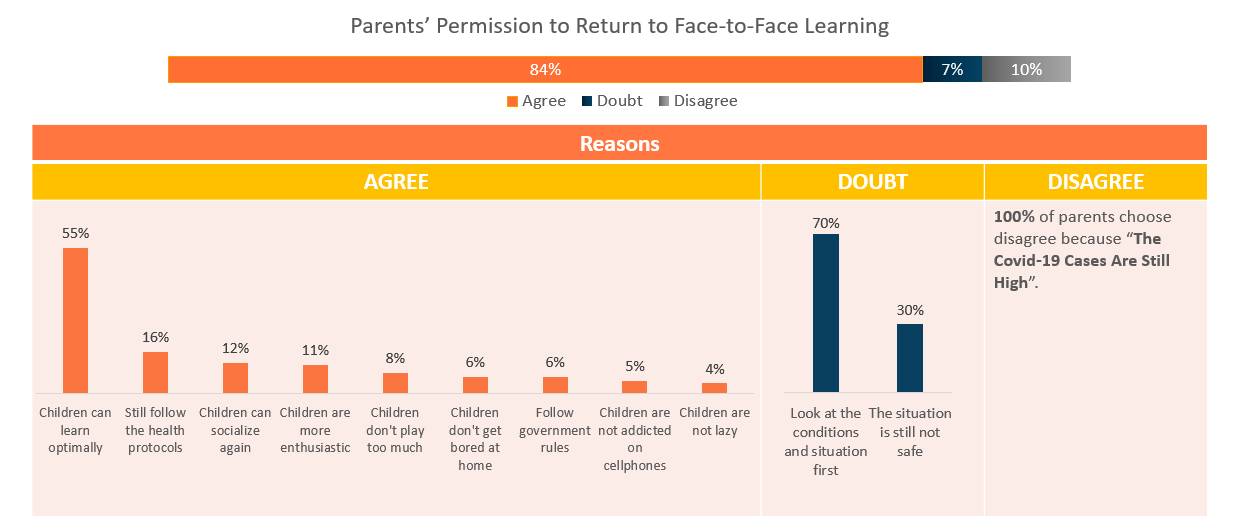Our survey results show that 84% of parents agree to return to face-to-face learning again, so their children can learn optimally and socialize again at school while still adhering to the health protocols. Meanwhile, there are still 10% of parents who disagree because currently the number of Covid-19 cases is still high.