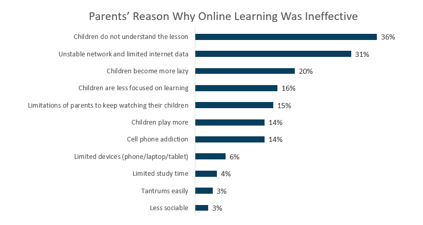 The previous results are in line with our next finding, where online learning is considered ineffective according to the majority of parents (77%). The main reason is caused by an unstable internet connection at home that makes their children confused and don’t understand the lesson. So the news related to the re-opening of learning activities in schools are welcomed positively by most parents because their children can learn optimally at school.
