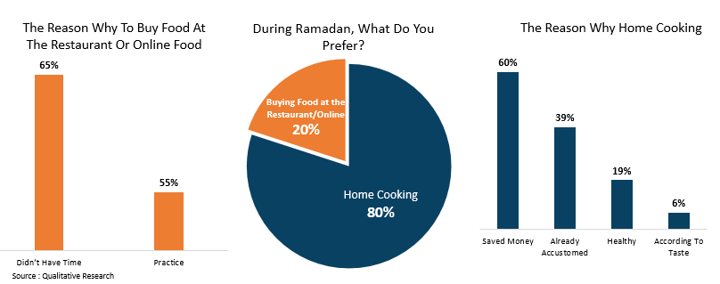 Ramadan is the month of praying and fasting for Muslims. However, when it comes to the fasting month, needs also increased, such as stocking up on basic needs for suhoor and iftar, buying new clothes, & new prayer stuff. As a result, Muslims who predict that they can save a lot during fasting turn out to spend more during Ramadan. In order to save more money, 80% of respondents prefer to cook at home instead of eating outside.