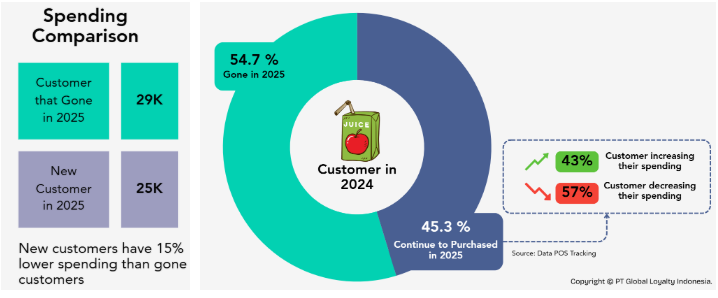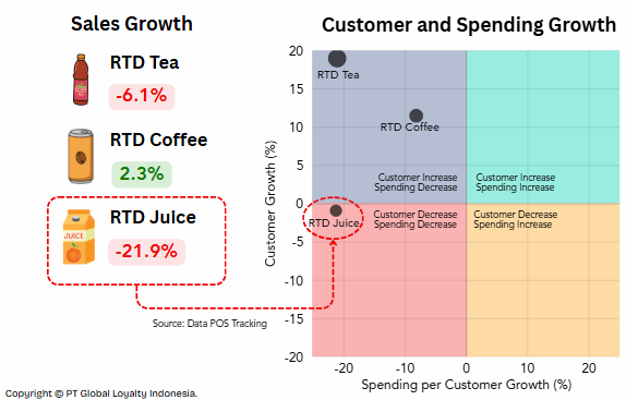 Around 54.7% of customers who purchased RTD Juice in 2024 stopped buying it in 2025. The spending of these “gone customers” was higher than that of new customers, who did not purchase in 2024 but did in 2025. Among customers who continued purchasing RTD Juice across both years, most decreased their spending. The lower spending of new customers, combined with the reduced spending of continuing ones, led to an overall decline in RTD Juice spending per customer.