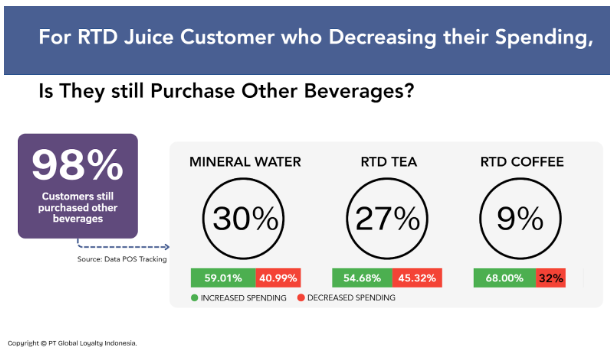 For RTD Juice customers who still purchased RTD Juice but decreased their spending, 98% also bought other beverages. Mineral Water and RTD Tea became their main choices. In those categories, their spending increased — indicating a shift in wallet share from RTD Juice to other beverages.