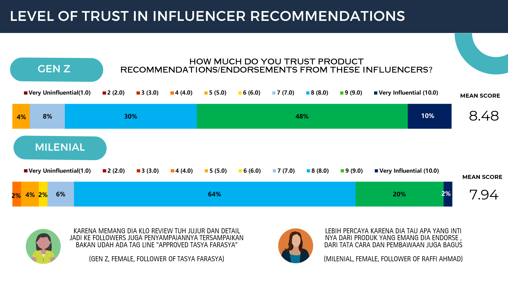 Tasya Farasya is most trusted by Generation Z because she reviews products honestly, in detail, and her followers appreciate her ability to effectively convey messages. There is even a tagline "Tasya Farasya Approved." On the other hand, Raffi Ahmad is most trusted by millennials because he understands the core of the products he endorses, and his manner and presentation are also commendable.