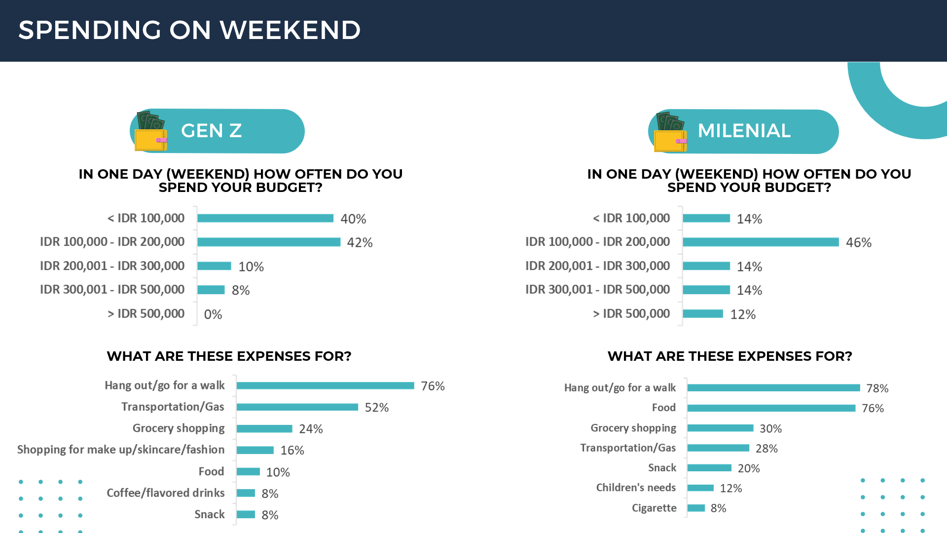 For the weekend, the expenditure of Gen Z and Millennials is almost the same, ranging from IDR 100,000 - IDR 200,000, mostly for hanging out.