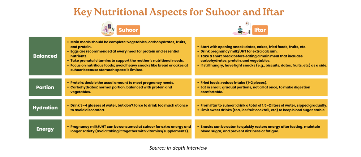 In addition to these strategies, pregnant women also need to pay attention to their nutritional intake during suhoor and iftar. The key nutritional considerations are summarized in the figure below.