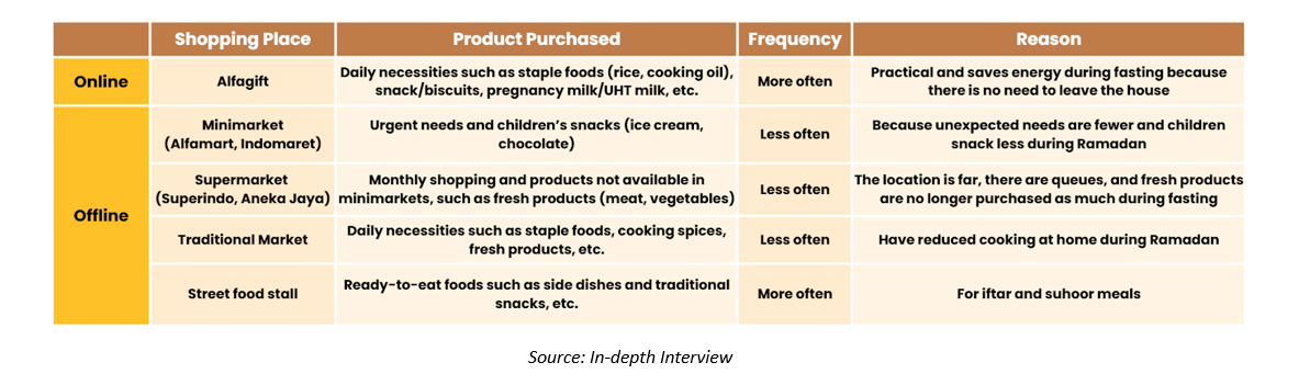 In conclusion, pregnant women who fast during Ramadan carefully consider their health, fetal well-being, and medical advice before deciding to fast. During fasting, they adopt various strategies to manage the physical demands and maintain balanced nutrition during suhoor and iftar. Meanwhile, their daily routines during Ramadan also influence their shopping behavior, with greater reliance on practical options such as online purchases and ready-to-eat foods.