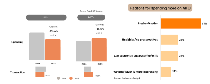 Their beverage choices are not exclusive, but complementary, driven by needs, occasion, and the need to keep experiences fresh. Consumers choose MTO when they want to try better quality, customize the drinks, and have a natural taste. If they want practicality and quick freshness, they will choose RTD.