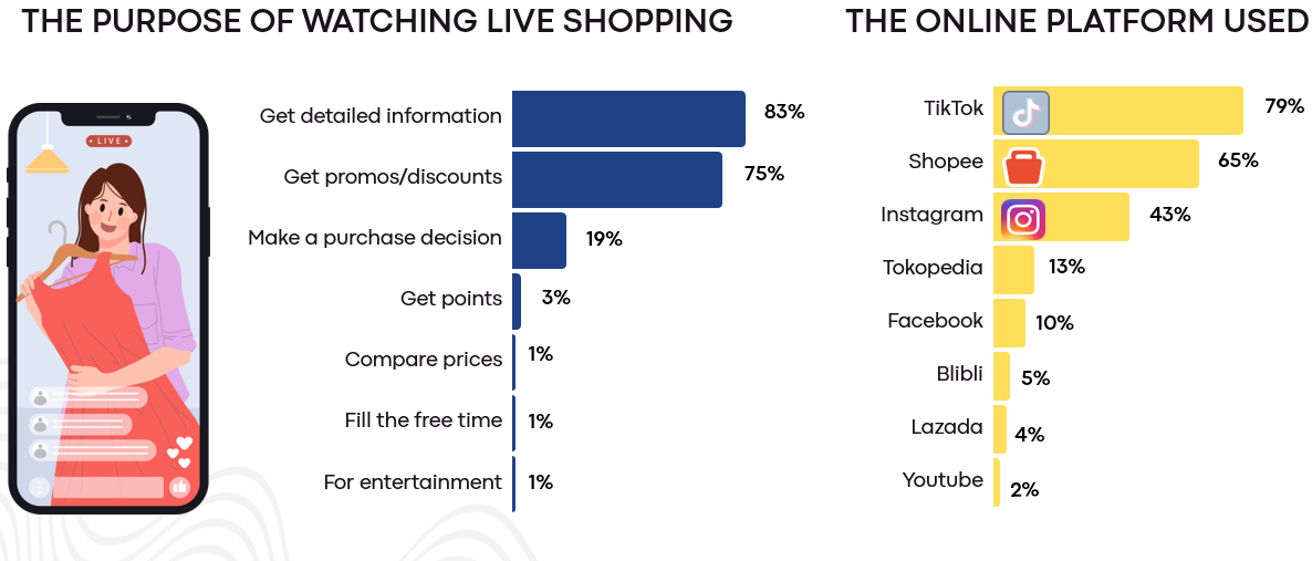 The main purpose of consumers watching live shopping is to get information about the products and also to get discounts/promotions. The majority of them watch live shopping on TikTok, Shopee, and Instagram.