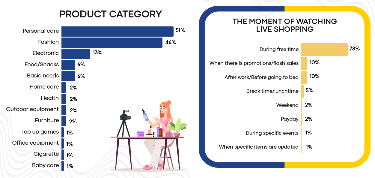 The most-watched product categories in live shopping are personal care and fashion. Most of them watch live shopping when they have free time.
