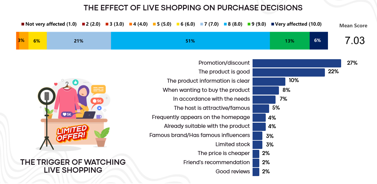 Overall, the majority of consumers perceive an impact on their purchasing decisions when watching live shopping. The most influential factors that attract consumers to engage in live shopping are promotions/discounts and high-quality products.