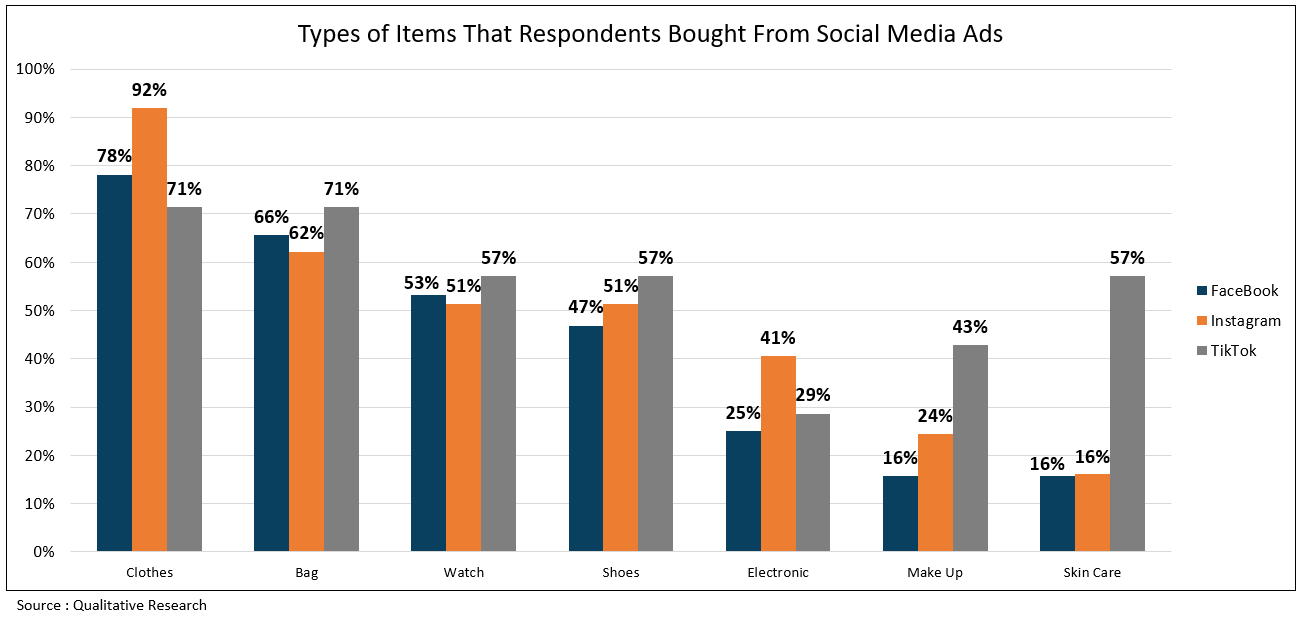 More specifically, you may wonder which social media platform can be the most effective for your brand? Based on the survey, fashion brands such as clothes, bags, watches, and shoes can be promoted on Instagram, Facebook & Tiktok because they are the most purchased items on those platforms. As for electronic products, it would be better to advertise the products on Instagram. And last but not least, for makeup and skincare products, TikTok is the best platform to promote your products.
