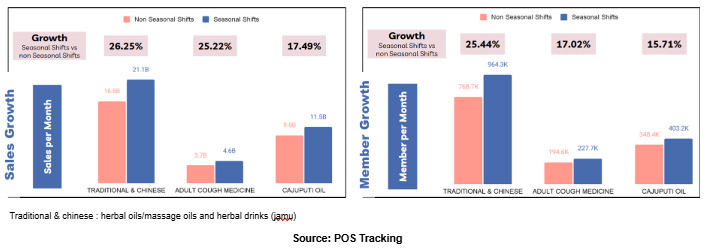 Based on transaction data, sales across certain health products show an increase during the seasonal shifts, with the most significant growth observed in the TRADITIONAL & CHINESE category. Rising sales during the seasonal shifts are driven by an increase in the number of members.