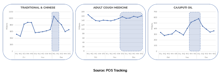 December marked the peak of health product sales during the Seasonal Shift. The TRADITIONAL & CHINESE and CAJUPUTI OIL categories experienced their highest sales in early December, while ADULT COUGH MEDICINE saw a consistent peak throughout the entire month.