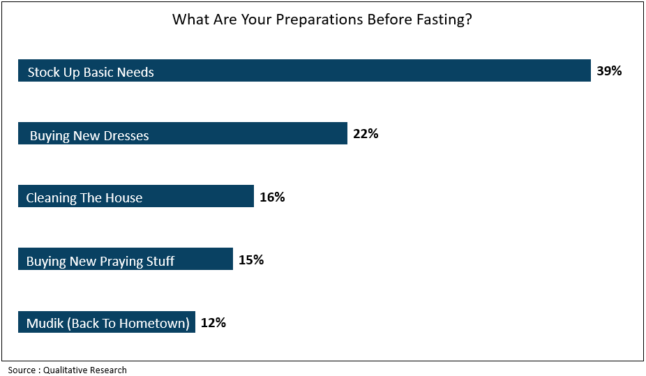 However, before discussing further about consumer behavior during Ramadan, let's take a look at their preparation before the fasting month. It turns out that the first thing to do is to stock up on basic needs for suhoor & fast-breaking, such as rice, cooking oil, and sugar. Followed by other preparations such as buying new dresses, cleaning the house, purchasing new prayer stuff, and mudik.