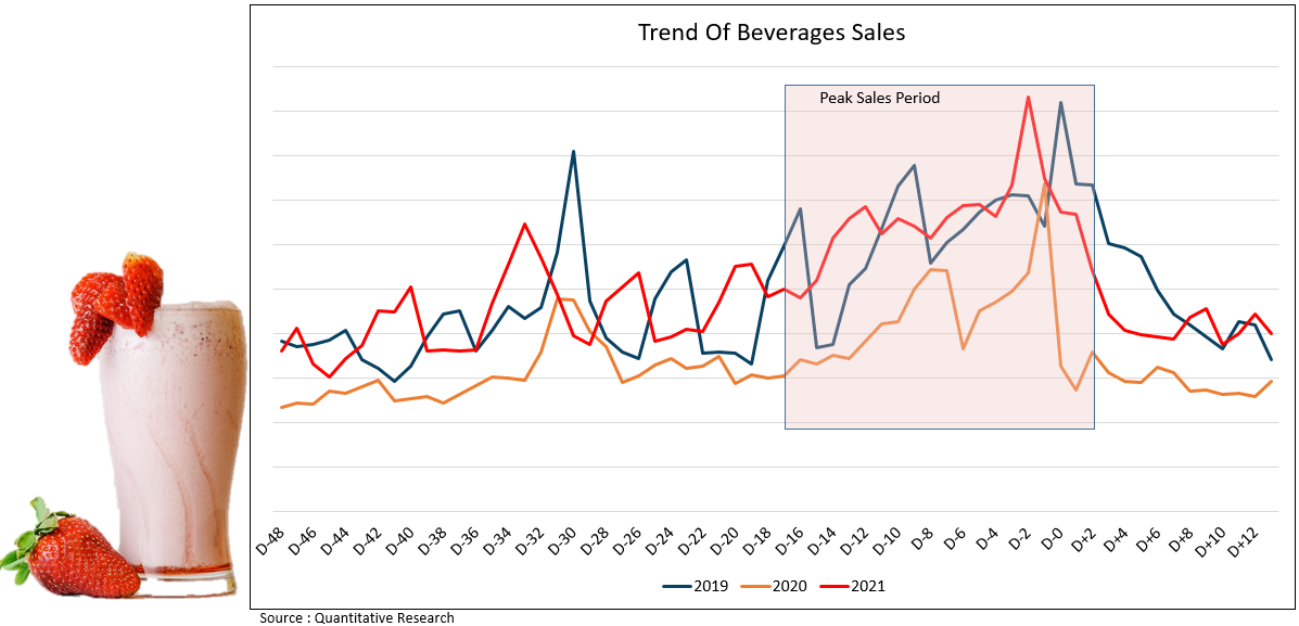 Similar to the snack and biscuit category, the beverages category reaches its peak season in the mid fasting until D+3 after Eid. Serving refreshing and sweet drinks to welcome Eid such as syrup, juice, and liquid milk has become a habit for Indonesian people.