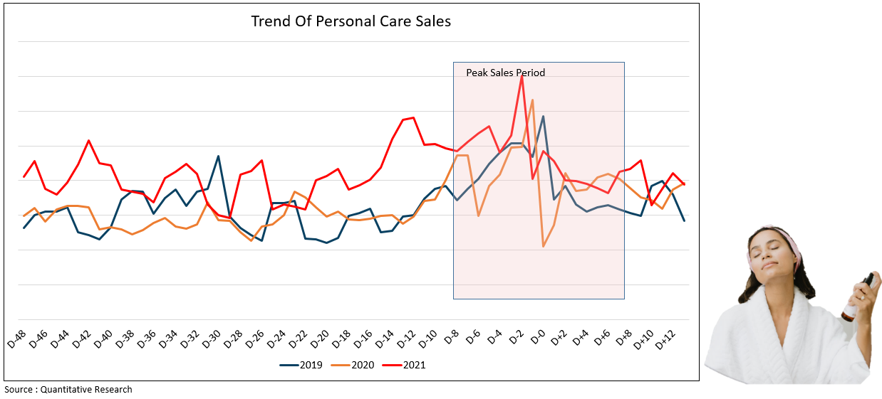 For the personal care category, the peak sales period also happens in the middle of fasting (15 days before Eid) until D+2 after Eid. This category contains several items such as skincare, makeup, and perfume. Of course, on this occasion, many Muslims like to celebrate this special day by dressing up, looking, and smelling good to meet friends and relatives.