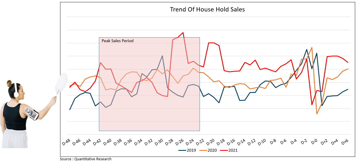 Meanwhile, the household category sales reach the peak from D-39 until D-19 before Eid. It means that people start to clean the house to welcome Eid during the fasting period.