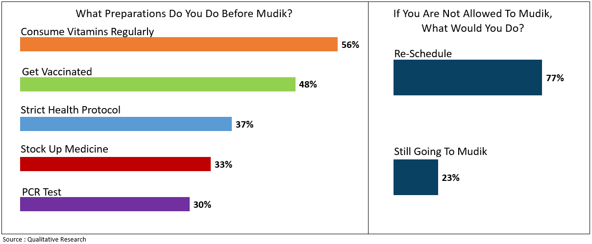Furthermore, the preparation before going to mudik is to consume vitamins regularly to maintain the immune system because the virus is still around. Another preparation is getting vaccinated, as mentioned before, those who already got the booster vaccination will find it easier to travel. Then, what happens if they are not allowed to mudik this year? What's the plan? 77% said they would reschedule the date, and 23% said they would still find a way to mudik. From the response, we can see public excitement for mudik this year.