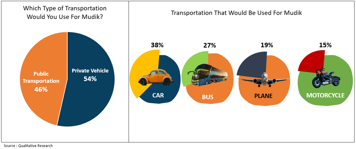 For this year's mudik trip, most respondents (53%) said they chose to use private vehicles such as cars. On the other hand, 47% of respondents plan to use public transportation such as buses.