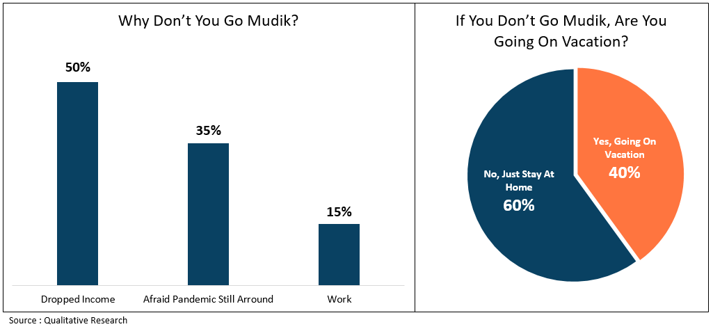 On the other hand, for those who decided not to mudik this year, the main reason is because of the dropped income. Some also said they were still afraid and unsure to travel during the pandemic. As a result, they prefer to stay at home and spend time with their loved ones.