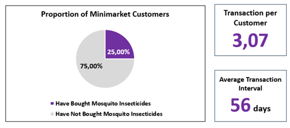 Out of people who have shopped at minimarkets, only 25% have purchased mosquito insecticides. It may imply that the demand for mosquito insecticides is still not very high. On average, buyers of mosquito insecticides make approximately three purchases at minimarkets, with a repurchase interval of around 56 days.
