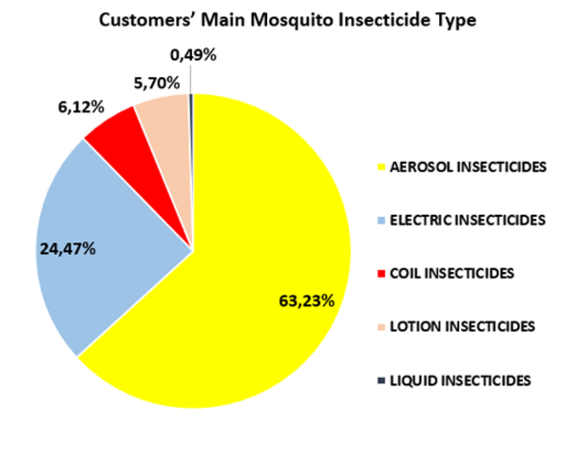 This consistency may also indicate that mosquito insecticide consumers have personal preferences that make them feel comfortable. Among the several mosquito insecticide types commonly sold in minimarkets, aerosol insecticides are the top choice for most minimarket consumers with a proportion exceeding 60%. Electric insecticides are also quite popular with consumers with a proportion of almost 25%.