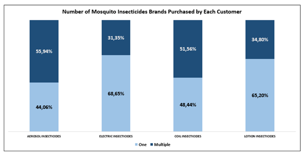 Despite having individual preferences for specific types, the same principle does not necessarily apply to brand preferences within each type. While consumers of electric and lotion insecticides typically show a strong inclination toward a particular brand, consumers who use aerosol and coil insecticides tend to lack a specific brand preference. This is evident in the slightly larger proportion of multiple-brand buyers in aerosol and coil types while the proportion of single-brand buyers in electric and lotion types far exceeds multiple-brand buyers with a difference exceeding 30%.
