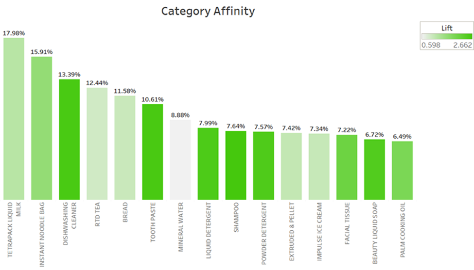 Additionally, among the 15 categories of items most commonly bought alongside mosquito insecticides in minimarkets, a strong association was observed between mosquito insecticides and household products (such as dishwashing cleaner and detergent) and personal care (such as toothpaste, shampoo, tissue, and soap). The association is reflected in the high lift values in these categories, which are indicated by the solid green color. The association is positive, suggesting that the purchase of mosquito insecticides along with household and personal care products is not a coincidence. It suggests that mosquito insecticides are purchased intentionally together with personal and household hygiene items.