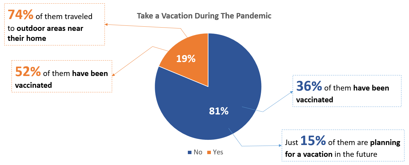 Our survey results show that only 19% of people went on vacation during the pandemic, 74% of them traveled to outdoor areas near their homes, and half (52%) of people who went on vacation during the pandemic have been vaccinated. That brings us to the conclusion that people's confidence to travel and enjoy outdoor activities increases after they are vaccinated.
