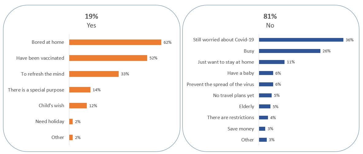 Now, Let’s dive into the reasons why people decided to take or not to take a vacation during the pandemic. Survey showed the main reason people went on vacation is because they are feeling bored at home. On the other hand, the main reason why 81% of people decided not to take a vacation is because they are still worried about the coronavirus.