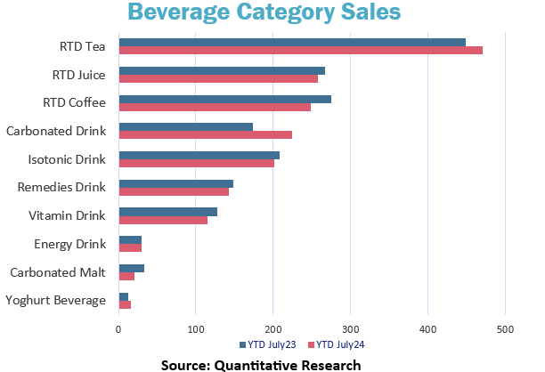 In contrast, the beverage category has seen a decline across most segments over the past year.